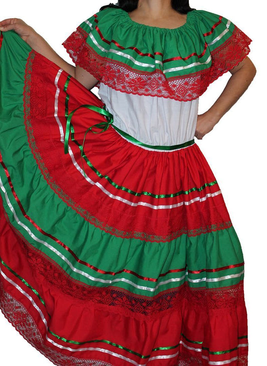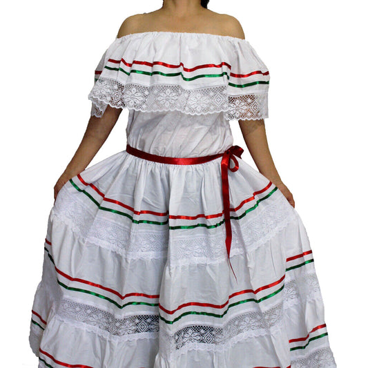 TRICOLOR WHITE PEASANT MEXICAN LACE DRESS OFF SHOULDER CINCO DE MAYO COSTUME ONE SIZE